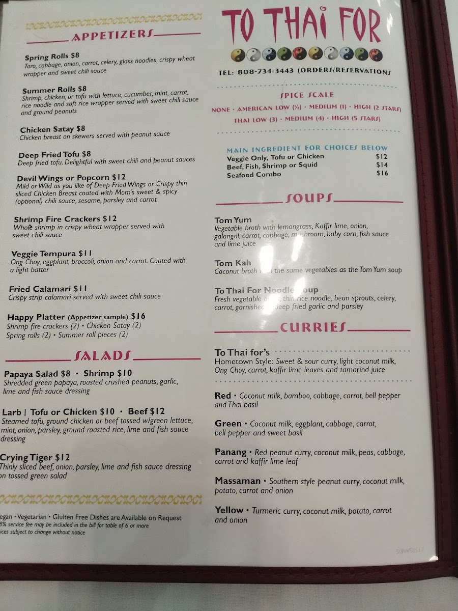 Welcome to To Thai For Restaurant, where culinary excellence meets the vibrant flavors of Thailand. Located at 3571 Waialae Ave, Honolulu, this establishment crafts an array of authentic dishes that tantalize the taste buds. The dinner menu features exciting appetizers like Shrimp Firecrackers and Crispy Calamari, both priced at $17, setting a delightful tone for your meal.